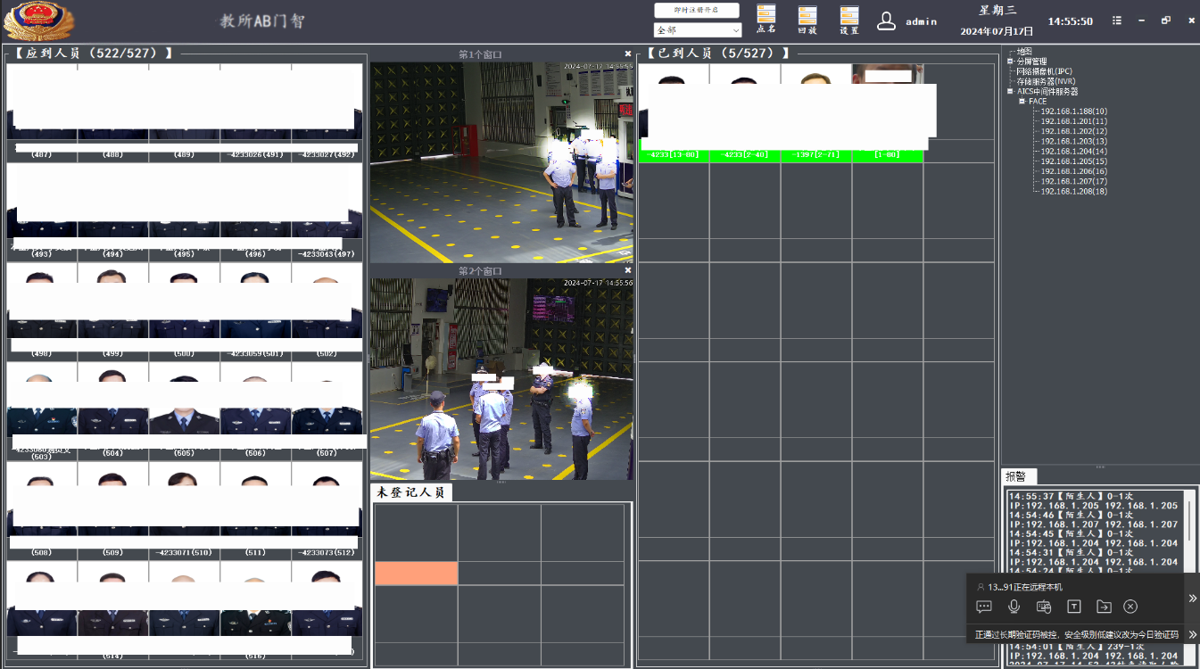 案例簡述:智慧監(jiān)獄無感車間人臉點名播報系統(tǒng),是專門針對監(jiān)獄、監(jiān)所、監(jiān)舍、車間生產(chǎn)場所及大樓出入口等場景量身定制的一套點名系統(tǒng)解決方案:實現(xiàn)監(jiān)管場所出入口人員管控,可做黑、白名單比對和區(qū)域布控報警提示。可采集、提取并記錄存儲監(jiān)測區(qū)域內(nèi)人員(犯人、警員及外來人員等)人臉特征信息和圖片行動軌跡。代替原有的手動點名的工作,提升勞動效率,無需離開工作崗位,實現(xiàn)無感人臉點名,支持定時點名、手動點名多種點名方式,能夠減少獄警點名的工作量。